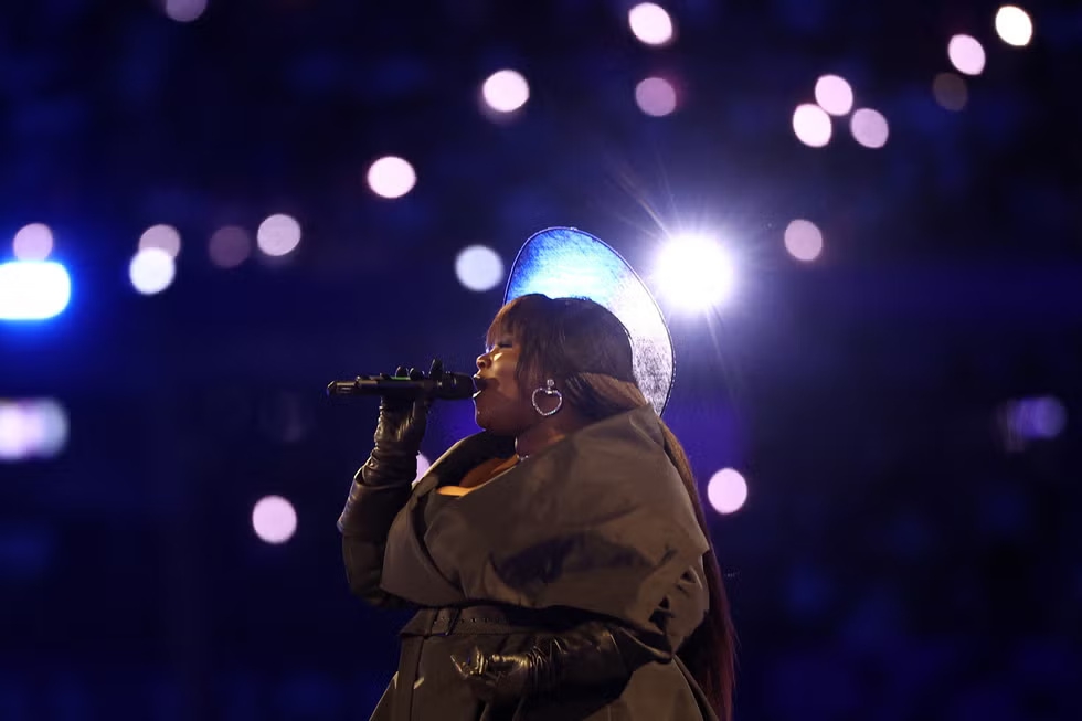 H.E.R. menyanyikan lagu kebangsaan Amerika Serikat.
