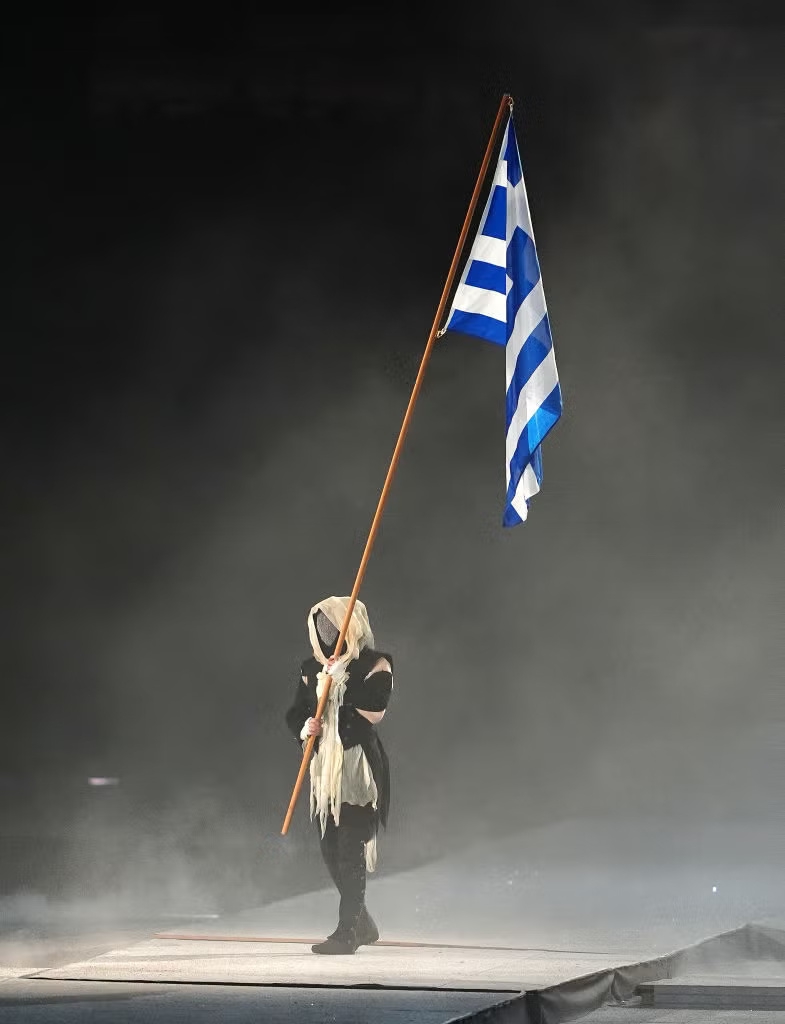 Tak lama kemudian, ia bergabung dengan beberapa karakter dari upacara pembukaan, termasuk satu yang membawa bendera Yunani. Lagu kebangsaan Yunani (tempat Olimpiade modern pertama kali diselenggarakan pada tahun 1896) bergema saat para penampil memberikan penghormatan kepada Olimpiade.