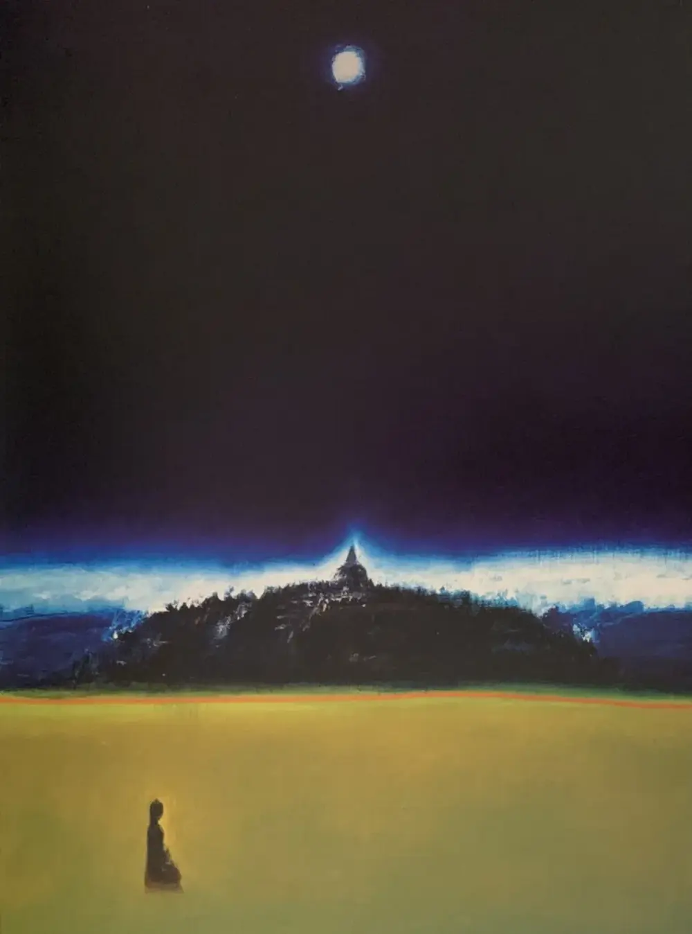 Srihadi, yang juga dikenal piawai mengolah harmoni warna dan ruang, menempatkan stupa-stupa Borobudur dalam komposisi yang memancarkan ketenangan, seakan mengajak para penikmat seni untuk menyelami keheningan candi di tengah cahaya fajar. Dengan sentuhan ekspresionisme yang khas, Mystical Borobudur menjadi jembatan antara kekayaan budaya Nusantara dan pandangan spiritual universal, menjadikannya karya yang terus relevan dan memikat di panggung seni rupa dunia.