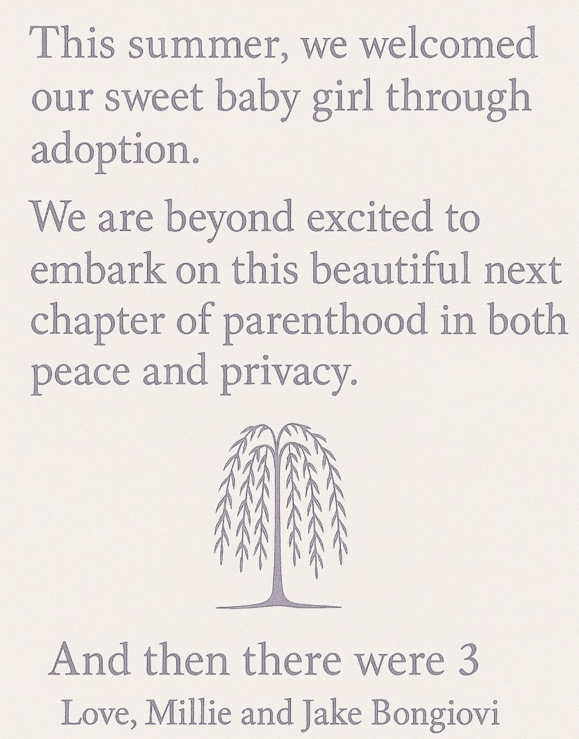 "Musim panas ini kami menyambut putri kecil kami melalui adopsi. Kami sangat bersemangat memulai babak baru yang indah dalam perjalanan sebagai orang tua dengan penuh ketenangan dan privasi," tulis mereka. "Dan kini, kami bertiga".