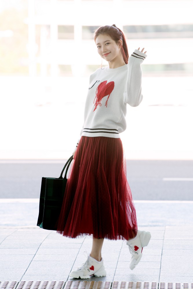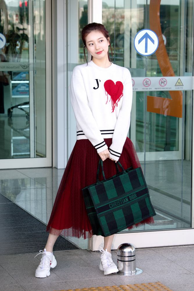 Suzy tampil mengenakan atasan sweater, rok tulle, dan sneakers tipe D-Connect, yang seluruhnya merupakan keluaran Dior.