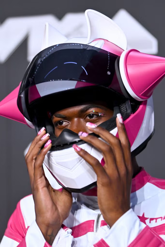 Helm mungkin menjadi daya tarik utama dari tampilan Lil Nas X, tetapi detail-detail kecil kecantikannya tidak boleh terlewatkan. Desain kuku berwarna pink dan batu permata di sekitar matanya memberikan sentuhan kilau yang pas.