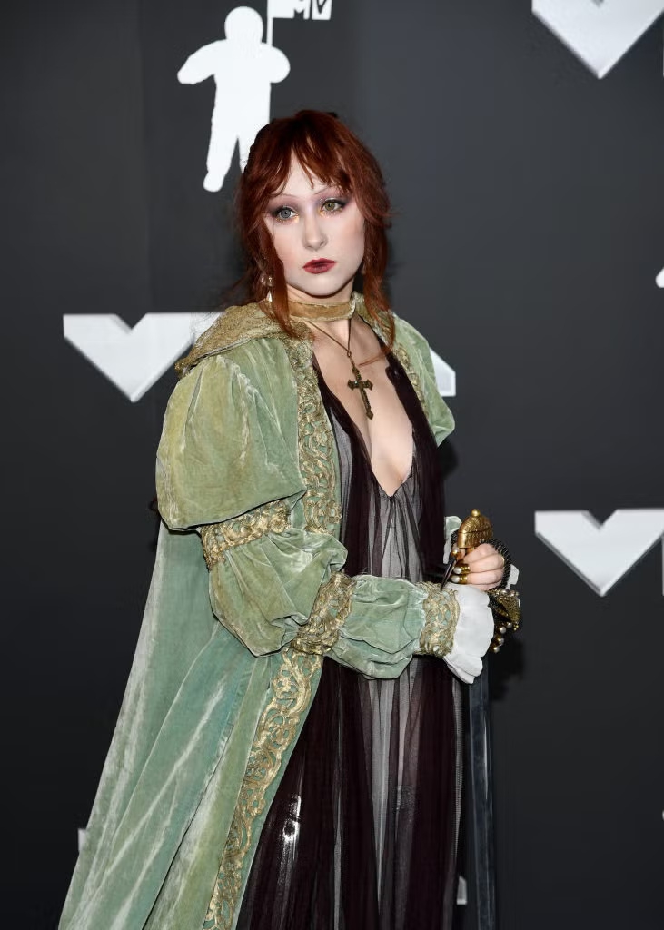 Chappell Roan terlihat seperti karakter yang langsung keluar dari buku fantasi favorit — dengan pedang, jubah, lipstik merah gelap, fair skin, dan alis tipis hasil kreasi seniman Andrew Dahling untuk MAC Cosmetics. Bahkan kukunya dibentuk menyerupai belati kecil. Tatanan rambutnya yang unik diciptakan oleh penata selebriti Dom Forletta menggunakan produk Bumble and Bumble serta perangkat dari Olivia Garden. Tapi yang paling memukau? Sentuhan eyeshadow metalik berwarna emas yang membingkai matanya dengan indah.