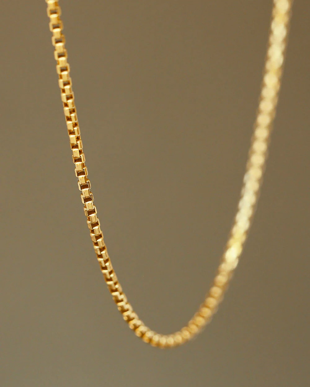 Model rantai box dikenal dengan bentuk kotak-kotak kecil yang saling mengunci rapat, sehingga membuatnya kuat dan tidak mudah putus. Desainnya sederhana namun tetap elegan, cocok untuk dipadukan dengan liontin maupun dikenakan sendiri. Karena strukturnya solid, kalung ini juga tahan terhadap tarikan ringan dalam aktivitas sehari-hari. Selain itu, kilau emas pada rantai box terlihat modern sekaligus timeless, sehingga dapat dipakai dalam berbagai acara, baik formal maupun kasual, tanpa khawatir cepat rusak.