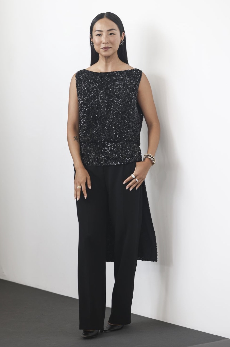 Satu-satunya penampilan Greta di luar rumah mode Dior hadir saat sesi pemotretan film A House of Dynamite, ketika ia memilih rancangan khusus serba hitam dari The Row, berupa atasan berpayet dengan potongan boat-neck yang menjuntai menjadi jubah panjang, dipadukan dengan celana lurus, flat kulit runcing, serta perhiasan campuran logam dari Tiffany & Co.