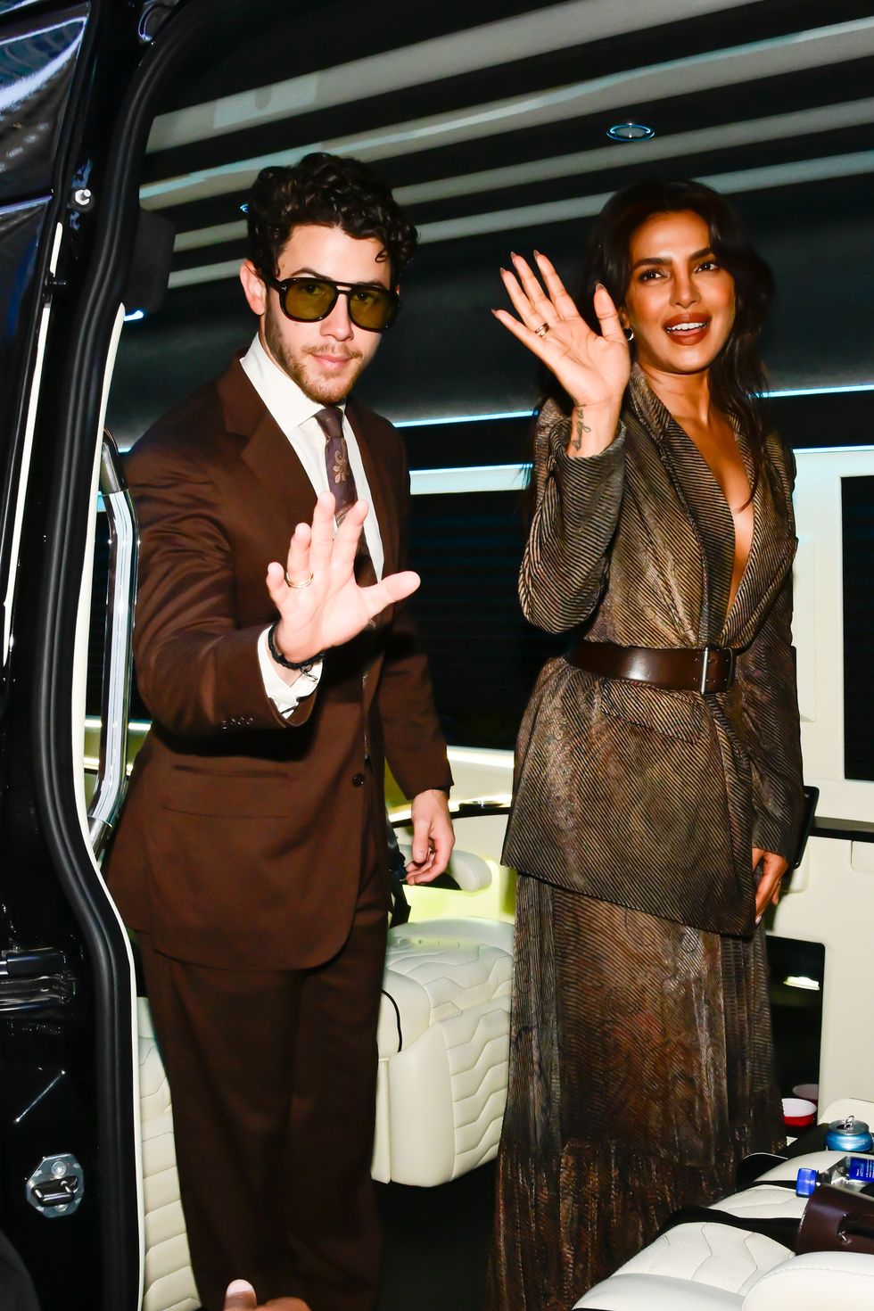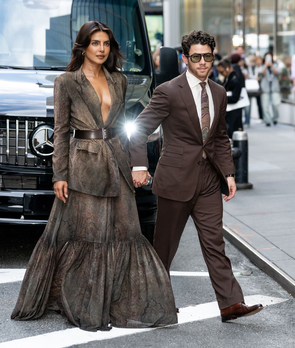 Sementara itu, Nick tampil dengan setelan jas berwarna espresso yang dipadukan dengan sepatu monk-strap dari Ralph Lauren. Ia mengenakan kemeja putih di balik jasnya serta dasi bermotif paisley, detail yang seakan menyelaraskan tampilannya dengan sang istri. Sebagai sentuhan akhir, ia menambahkan kacamata hitam tebal bergaya tortoise shell.
