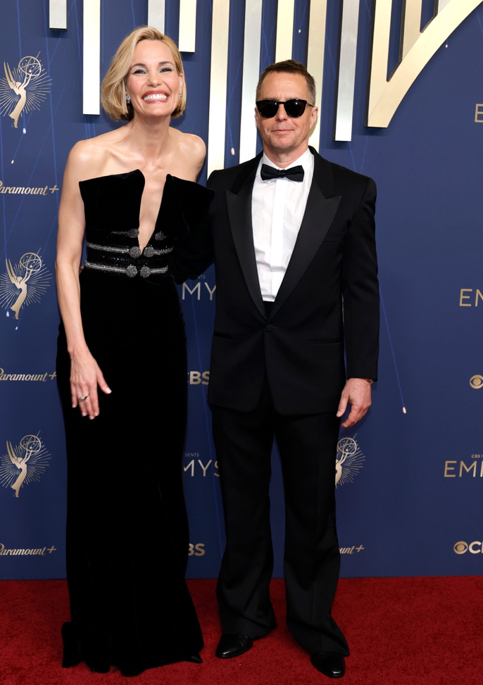 Di ajang Emmy Awards, keduanya tampil serasi dalam balutan busana hitam elegan. Leslie memilih gaun strapless panjang rancangan Armani Privé dengan potongan leher menjulang serta detail kristal di bagian pinggang, sementara Sam tampil rapi dalam tuksedo klasik yang dipadukan dengan kacamata hitam bergaya.