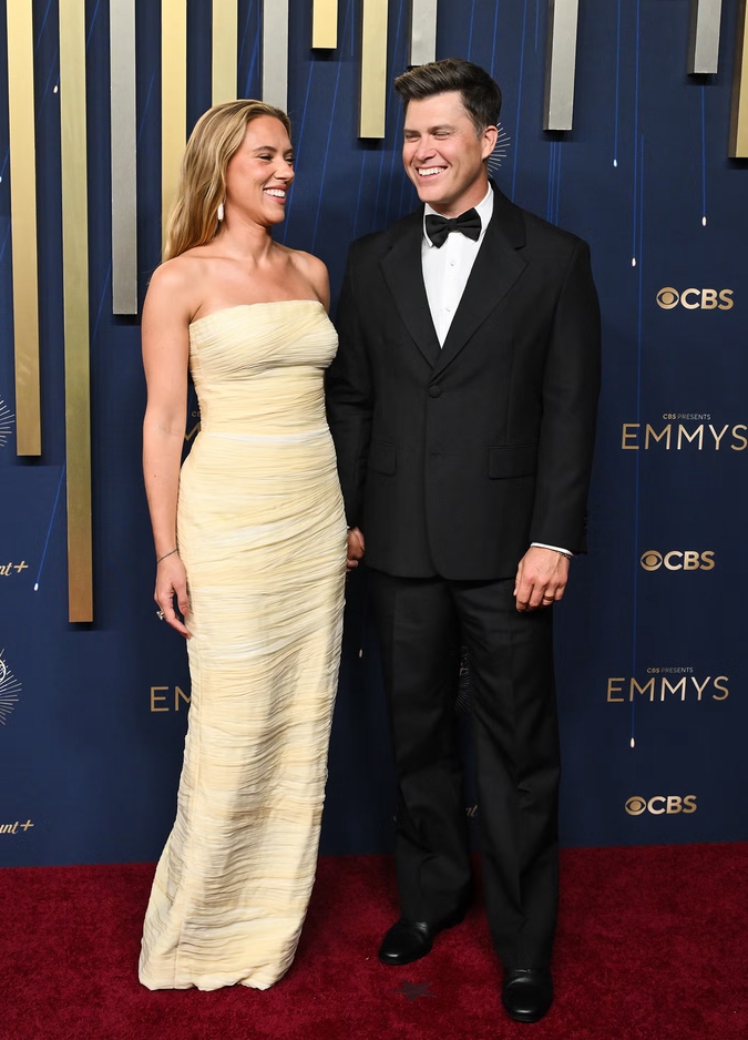 Dalam ajang Emmy Awards, Scarlett tampil memukau dengan gaun strapless kuning mentega beraksen ruched rancangan Prada. Sementara itu, sang komedian melengkapi penampilannya dengan tuksedo hitam elegan, juga dari Prada.