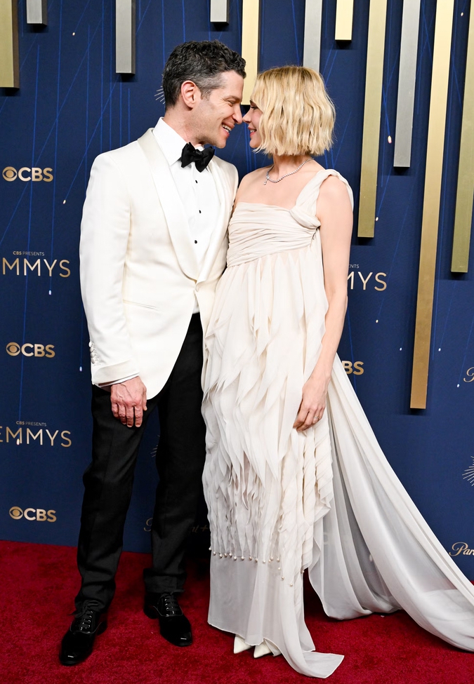 Tampil kompak dalam ansambel serba putih, pasangan ini terlihat tak bisa melepaskan pandangan satu sama lain di karpet merah Emmy. Michelle tampil bak mimpi dalam gaun boho mengalir yang dipercantik mutiara putih, sementara Thomas terlihat gagah dengan tuksedo berjaket putih, celana hitam, dan dasi kupu-kupu hitam.