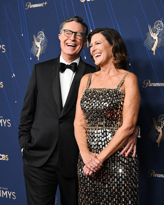 Dalam malam kemenangannya di Emmy, pembawa acara The Late Show With Stephen Colbert tampil klasik dengan tuksedo hitam. Sementara sang istri tampil serasi dalam balutan gaun hitam yang dihiasi plakat emas dan kristal bening, lengkap dengan anting hoop emas.