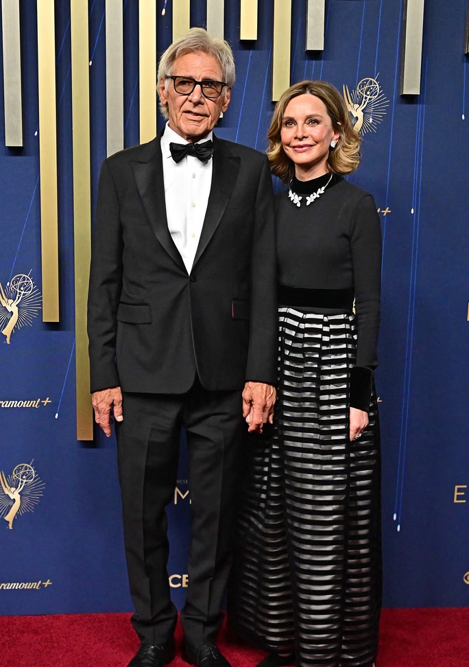 Di malam penghargaan Emmy, pasangan lama ini tampak serasi dalam balutan busana hitam-putih nan elegan. Harrison memilih tuksedo klasik yang abadi, sementara Calista tampil menawan dalam gaun hitam dengan detail garis horizontal transparan pada bagian rok yang memperlihatkan slip putih di bawahnya. Penampilannya semakin disempurnakan dengan black pumps, anting berlian besar, serta kalung berlian berbentuk bunga.