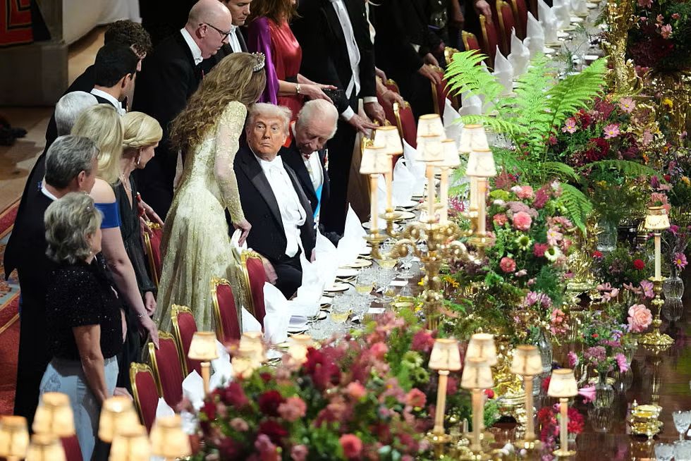 Setibanya di Windsor Castle dengan Air Force One, dan disambut oleh keluarga kerajaan Inggris, Raja Charles III, Ratu Camilla, Pangeran William, serta Putri Catherine, Donald dan Melania Trump langsung berganti busana untuk menghadiri jamuan kenegaraan yang digelar keluarga kerajaan.