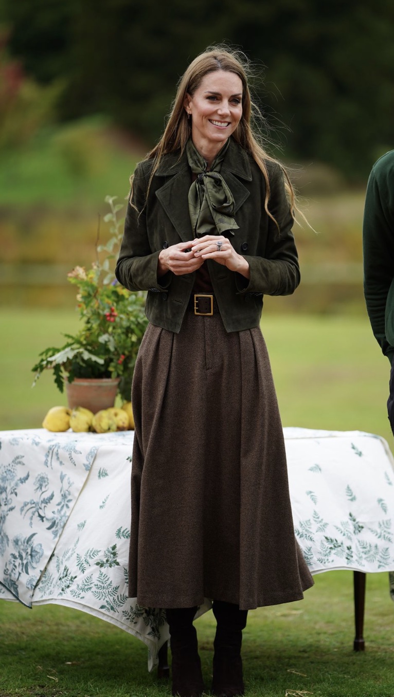 Putri Wales mengenakan jaket militer bergaya cropped berbahan suede hijau hutan yang dipadukan dengan rompi rajut warna karat, keduanya dari jenama London, Me+Em. Ia melengkapi tampilannya dengan syal bermotif yang diikat membentuk pita di leher. Aksesori tersebut juga berasal dari toko yang berbasis di Inggris, Sudbury Silk Mills Shop, toko yang kunjungannya bahkan pernah didokumentasikan Kate di masa lalu.
