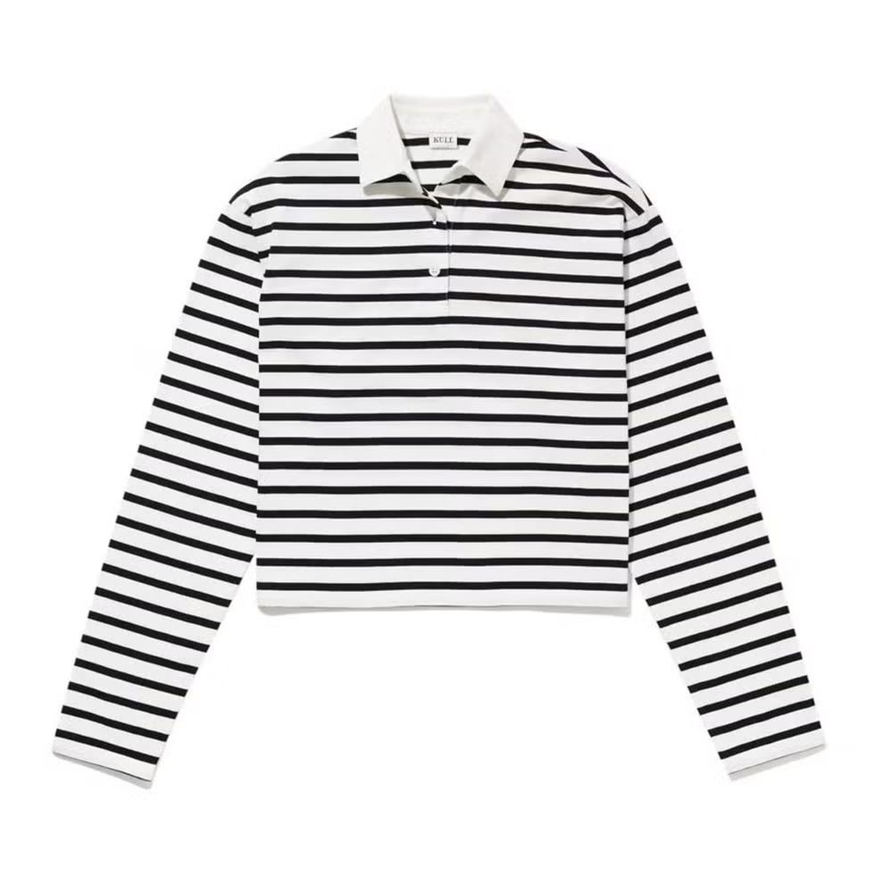 Untuk tampilan bersih dan sporty, coba padukan kemeja polo bergaris dengan celana wide-leg berwarna biru klasik. Perpaduan ini memberi kesan kasual namun tetap klasik, terutama jika dipadukan dengan blazer tanpa kerah, sehingga garis leher polo semakin menonjol. Sepatu Mary Jane dengan gesper dan tas selempang merah cerah menambahkan dimensi pada penampilan.