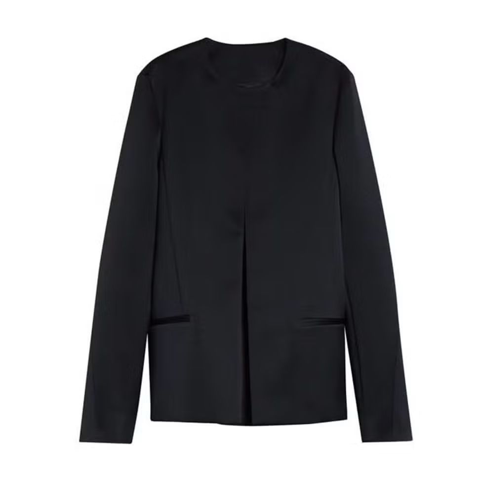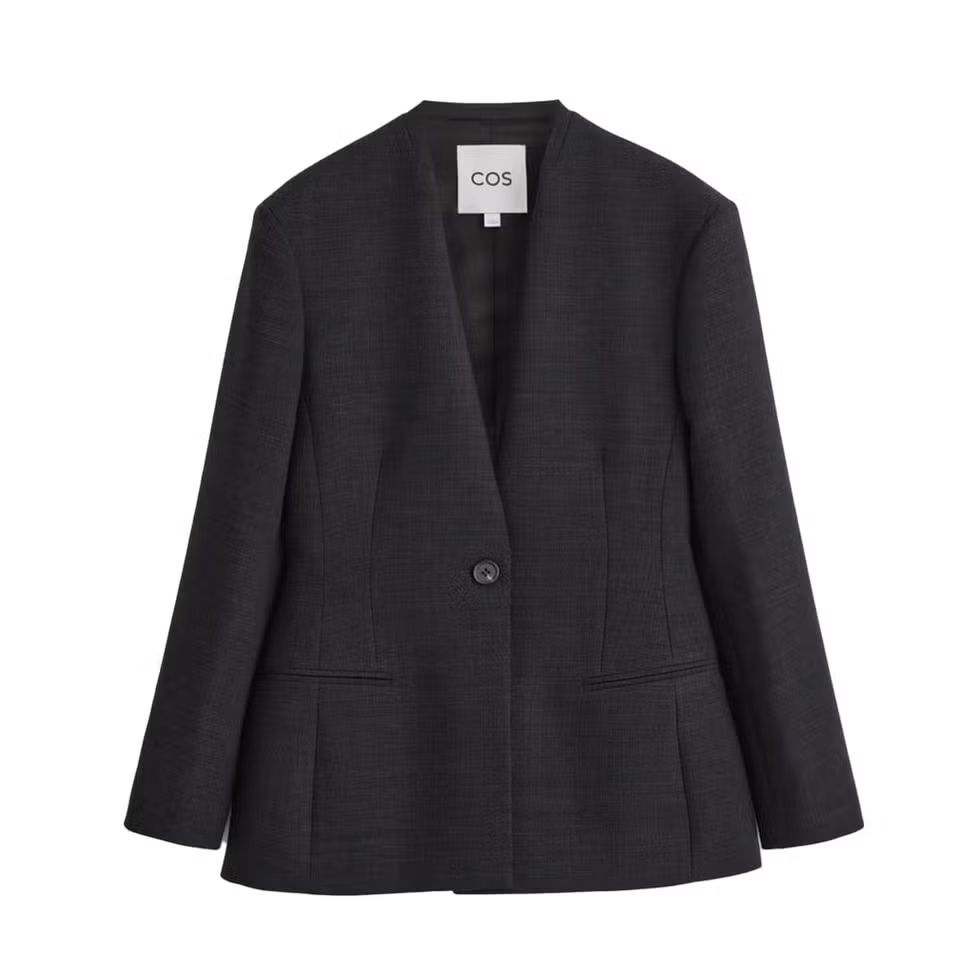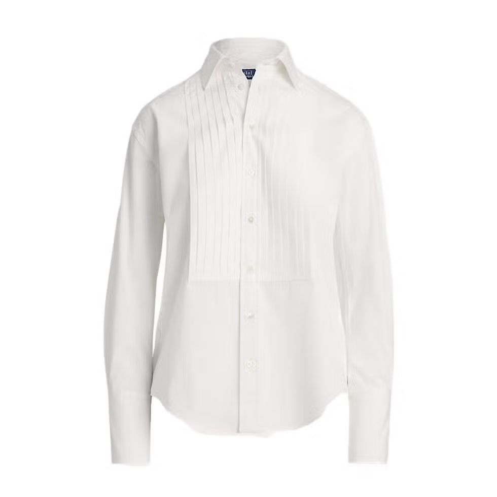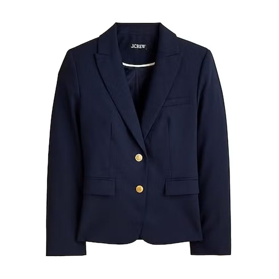 Menggabungkan item layering klasik terasa natural di musim ini. Blazer navy, kemeja tuxedo putih, dan celana trouser dark-wash menciptakan tampilan kantor yang rapi tanpa berlebihan. Sepatu mule suede dan tas terstruktur menambah kesan workwear yang tetap selaras dengan tren prep yang terlihat di runway.