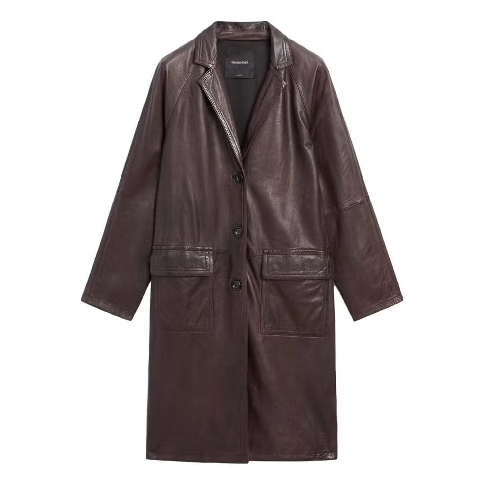 2. Trench Coat Kulit + Celana Wide-Leg yang Sudah Terasa “Worn-In”